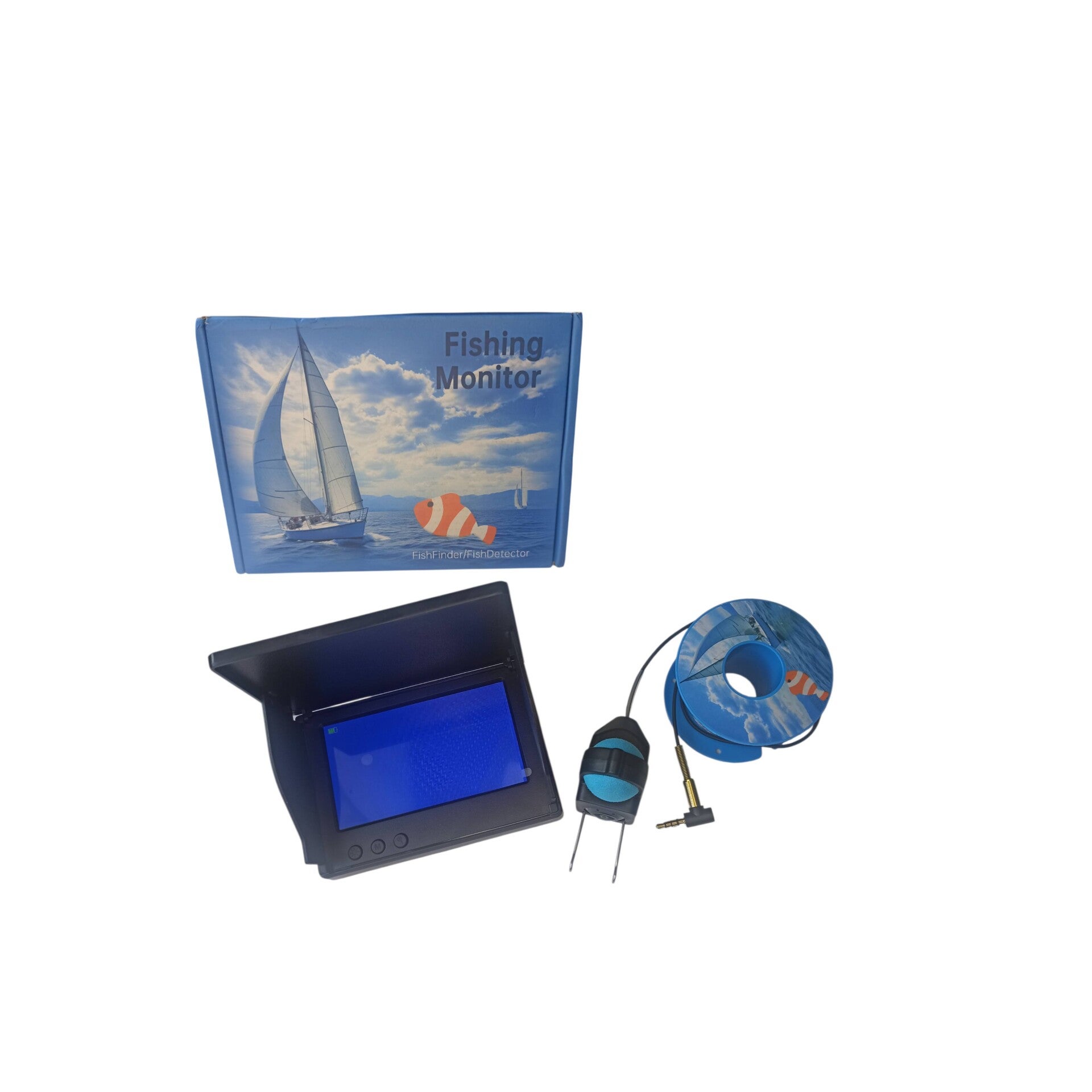 Fish Finder-Fish Detector P. 300,monitor subacquea, a filo, la confezione contiene 1 monitor, 1cavo di connessione monitor/telecamera mt15, 1 Telecamera,HD, 1 supporto x il monitor, da agganciare su barre, ecc..... 1cavo di ricarica x monitor, manuale istruzioni.